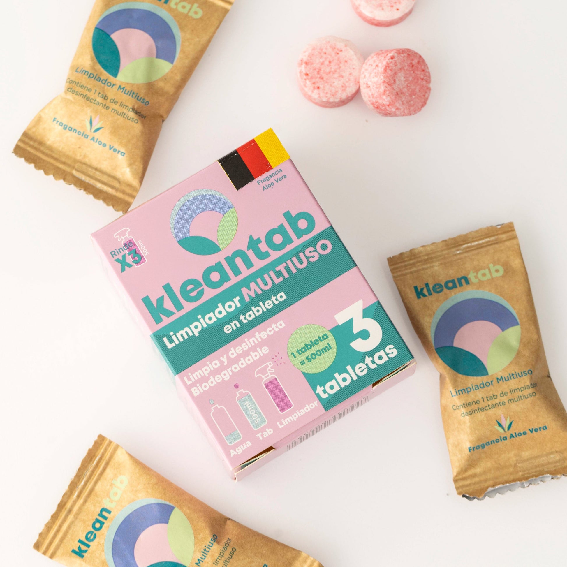 Cada tableta rinde 500 ml de limpiador desinfectante multiuso / baño / cocina / vidrio.