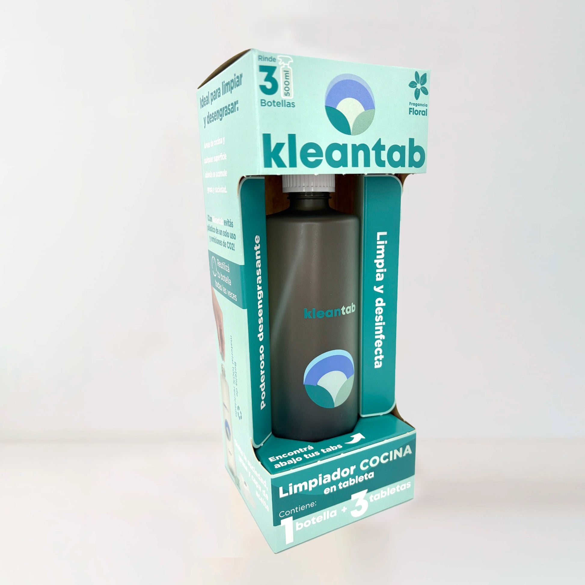 Incluye: 1 botella atomizadora reutilizable de material 100% reciclado de 500 ml y 3 tabletas Kleantab Limpiador Cocina.